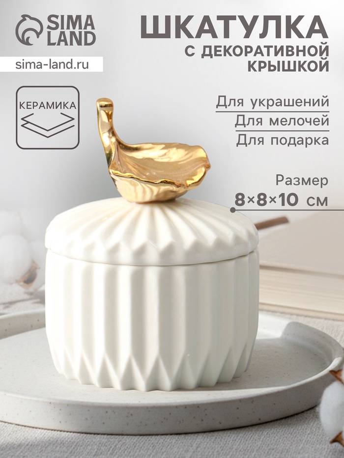 Шкатулка для украшений с крышкой «Золотой лист Гинкго», керамика, белая, 8×8×10 см