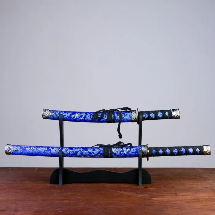 Макет оружия «Сувенирные катаны на подставке 2в1. Драконы золото на синем», подарочный набор, ножны ткань, 47 см; 70 см