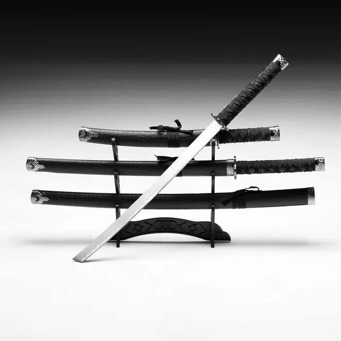 Макет оружия «Сувенирные катаны на подставке 3в1. Чёрный питон», подарочный набор, ножны кожзам, матовый, 46 см; 70 см; 89 см