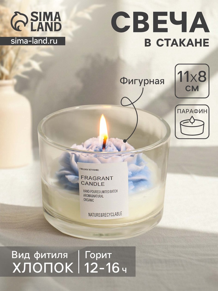Свеча в стакане «Нежно-голубой пион», 11×11×8 см