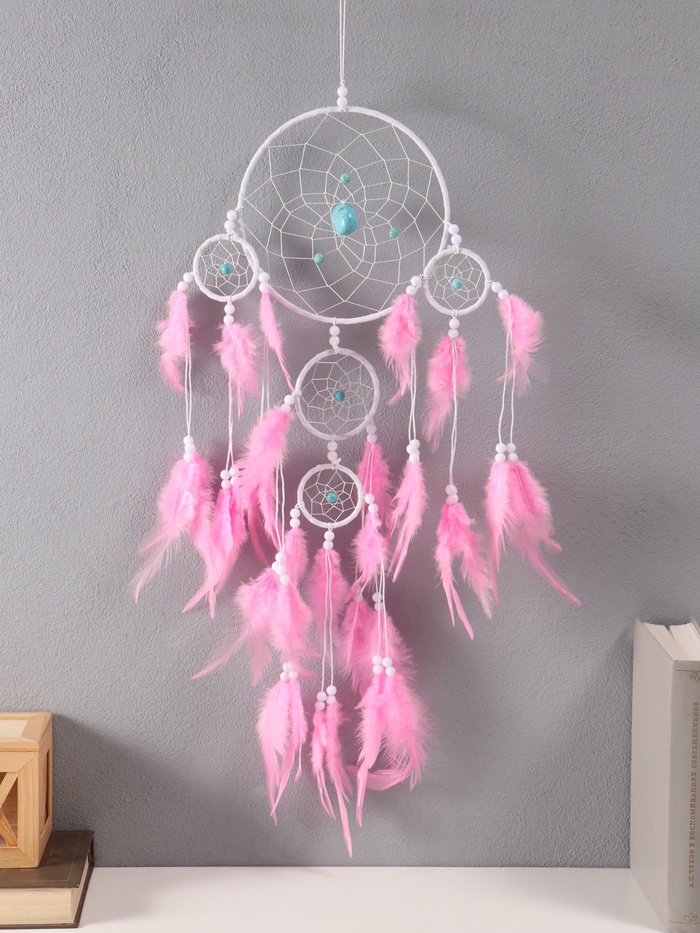 Ловец снов "Оберег с камнем Бирюза" бело-розовый 35х66 см