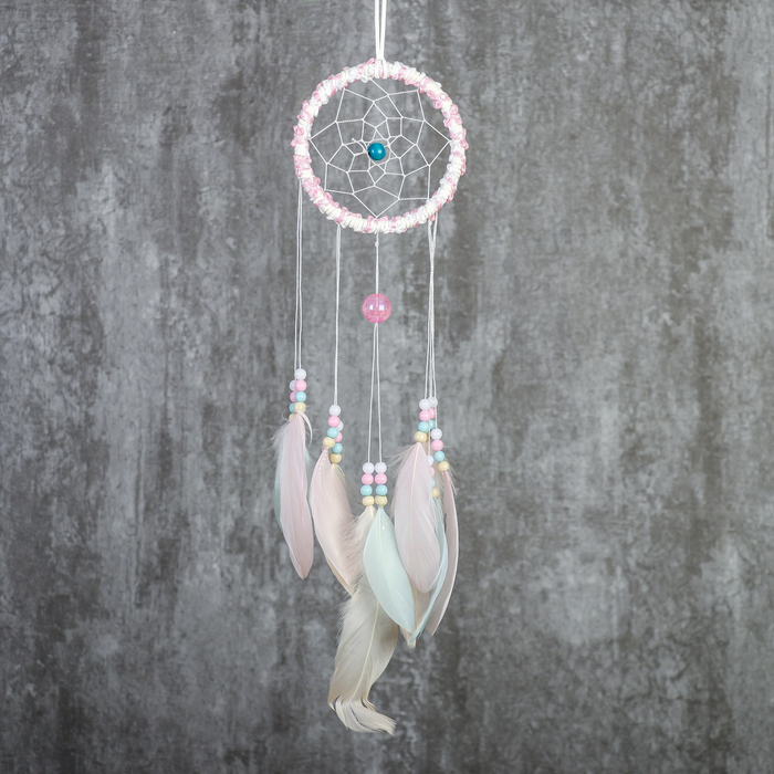 Ловец снов "Паутинка с пёрышками пастельных тонов" d=11,5 см длина 48 см