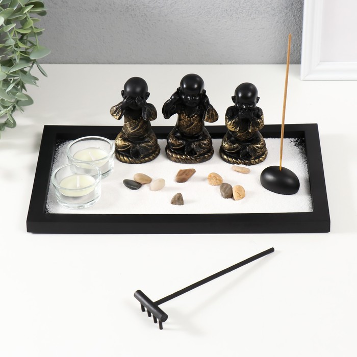 Японский сад камней настольный «Дзен. Ничего не вижу, не слышу, не скажу», 2 свечи, набор аксессуаров, 28×16.5