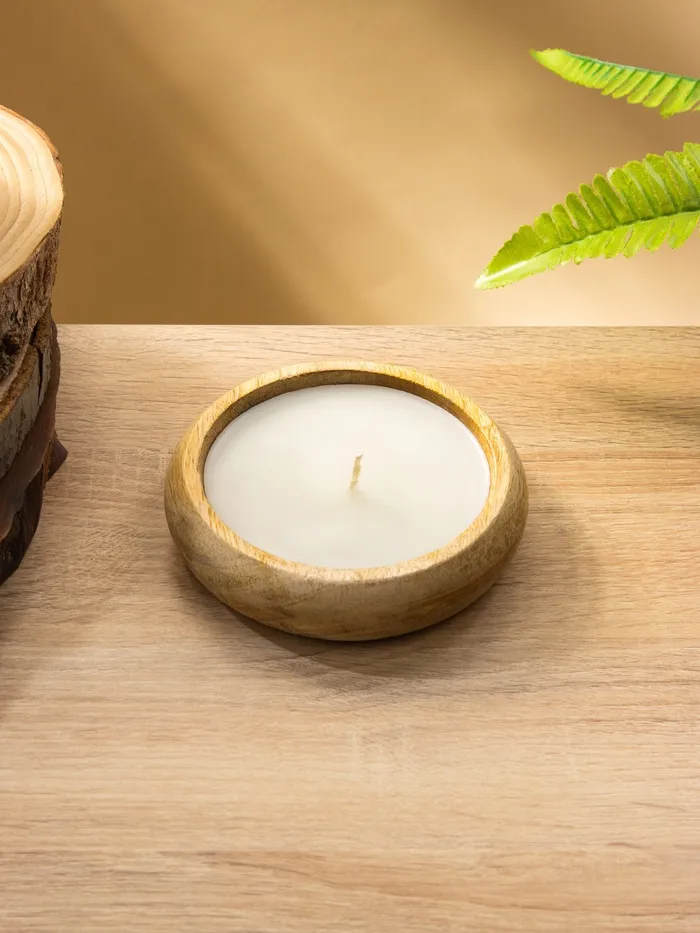 Свеча в деревянной чаше, парафин и соевый воск, 12.5×12.5×2.5 см