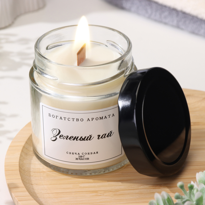 Ароматическая свеча в банке, 150 г, из соевого воска, деревянный фитиль, зелёный чай