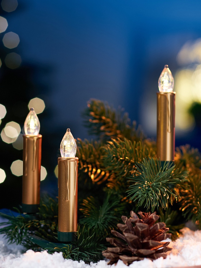 Светодиодные «Свечи на прищепках золотистые» 9 см, набор 10 шт., 10 LED, от батареек АААх10, пульт, свечение тёплое белое