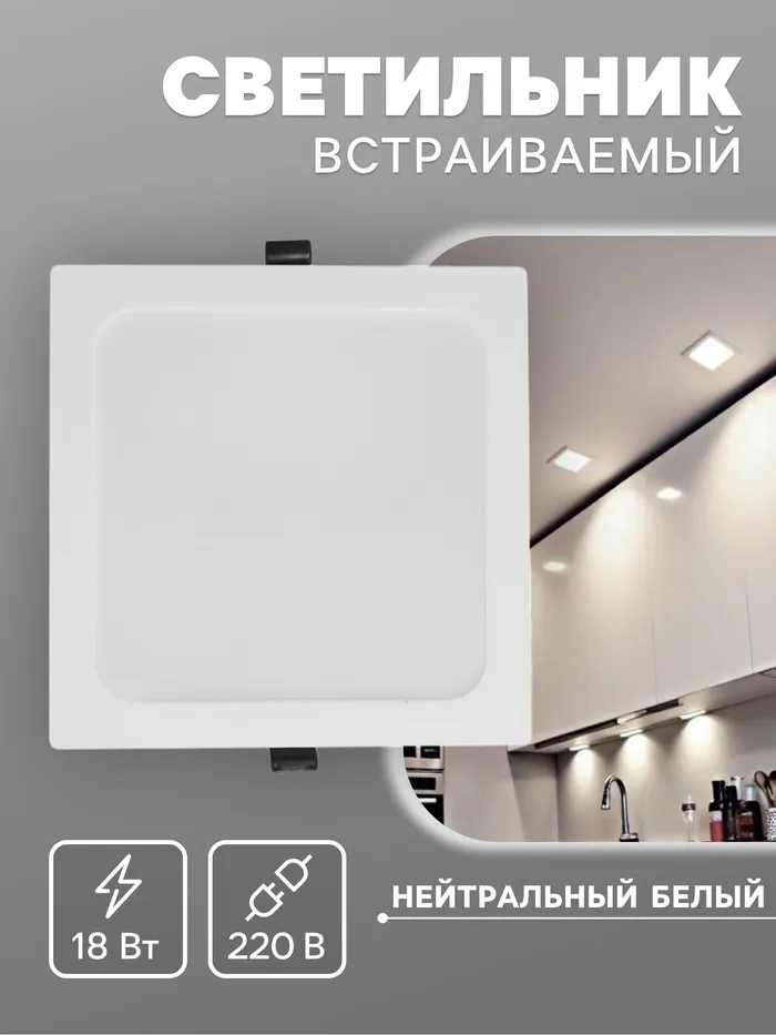 Светильник встраиваемый «Даунлайт», светодиодный, 18 Вт, 4000K, 1710 Лм, 220 В, 176×28 мм, квадратный, белый