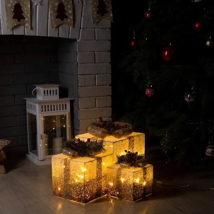 Светодиодная фигура «Бежевые подарки» 15, 20, 25 см, текстиль, металл, 220 В, свечение тёплое белое