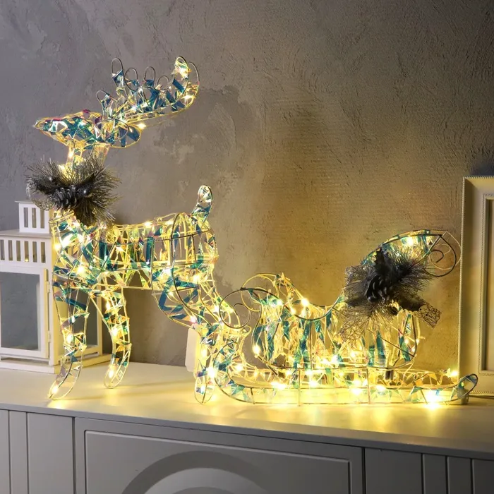 Светодиодная фигура «Олень с санями серебристый», олень: 50 × 85 × 18 см, сани: 70 × 43 × 22 см, металл, 220 В, свечение тёплое белое
