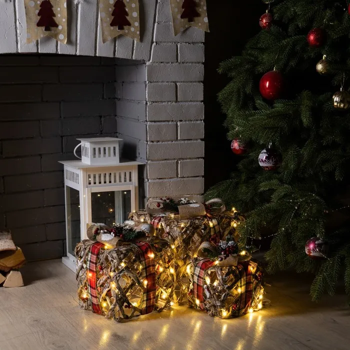Светодиодная фигура «Подарки с серой лентой» 15, 20, 25 см, текстиль, металл, 220 В, свечение белое