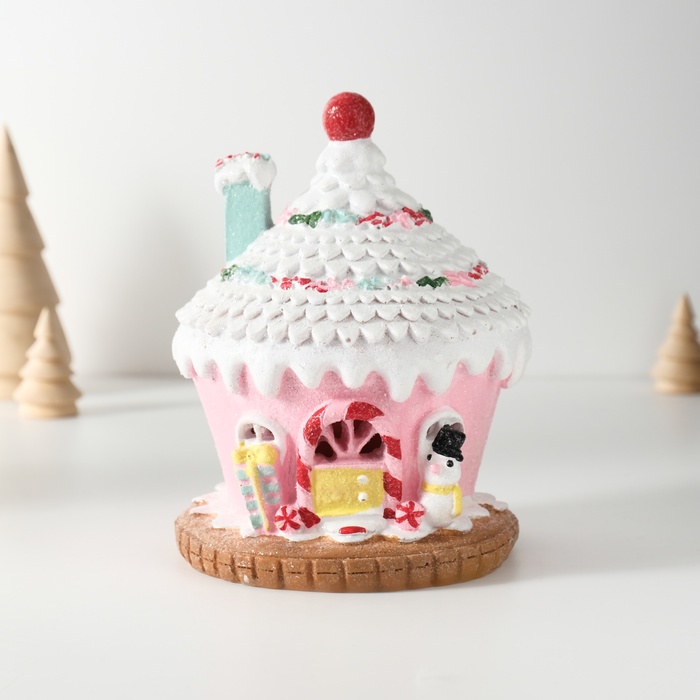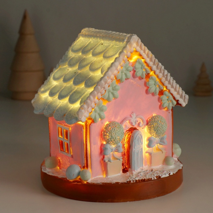 Фигурка световая полистоун «Пряничный домик розовый в глазури со снеговиком», 11.5×11.5×15 см