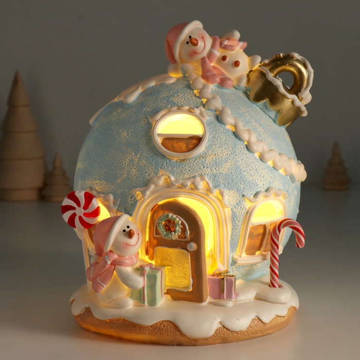 Фигурка светящаяся «Пряничный домик-елочный шар, со снеговиками», зефирный, 17.5×16×18 см