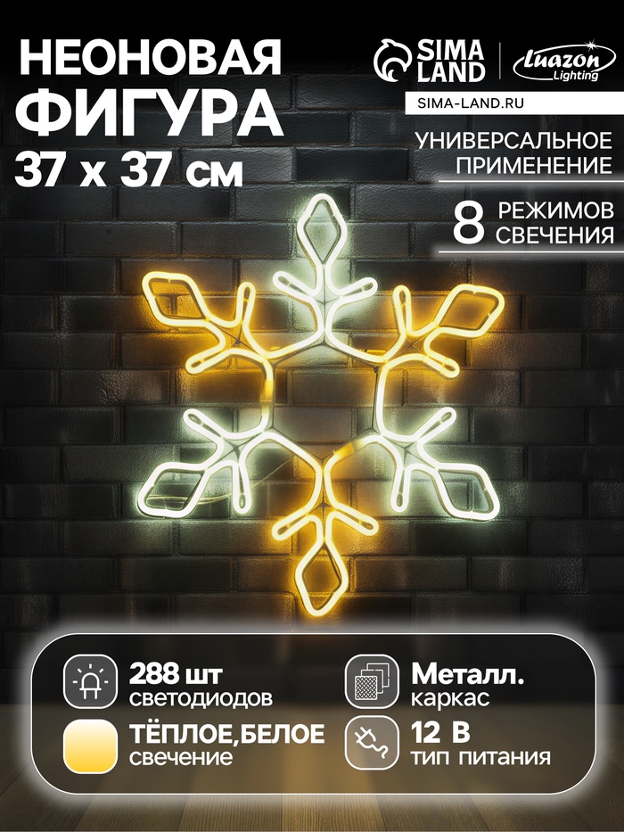 Неоновая фигура «Снежинка», 37 см, 288 LED, 12 В, 8 режимов, свечение белое/тёплое белое