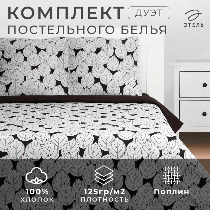 Постельное бельё Этель дуэт "Black leaves" 143х215 см 2 шт, 220х240 см, 70х70 см 2 шт, поплин, 125 г/м2