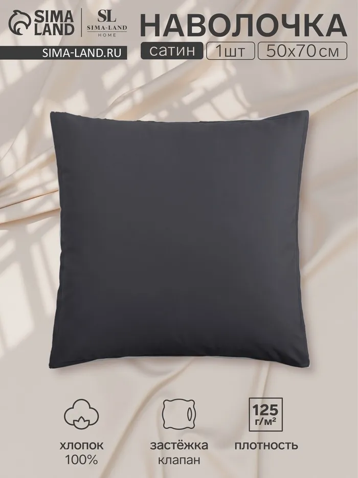 Наволочка Этель 50х70 см, цвет темно-серый, мако-сатин, 114г/м2, 100% хлопок