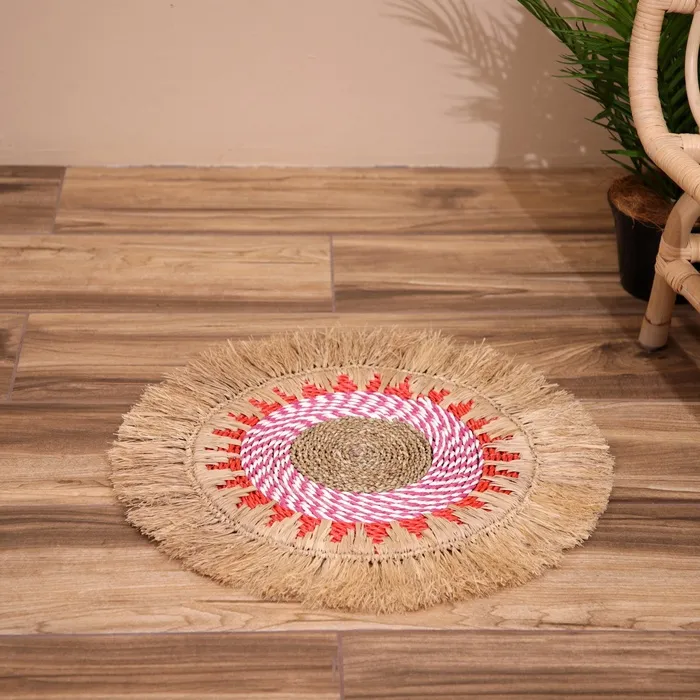 Коврик круглый натуральный плетёный «Солнышко» на пол, из бананового листа, 50 см, красный