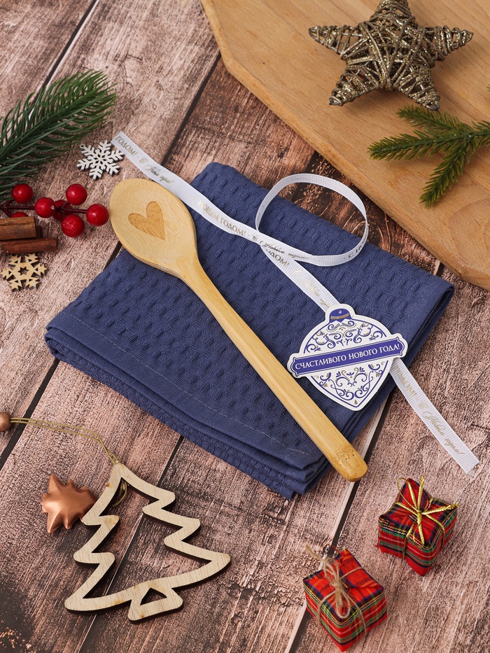 Набор подарочный «Доляна» Winter: синее полотенце 35×60 см, хлопок 100%, вафля 220 г/м², деревянная ложка