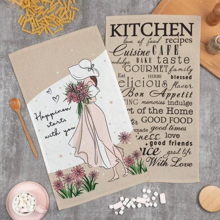 Набор кухонных полотенец Доляна Happiness, 35х60 см -2 шт, 100% хлопок, вафля 160 г/м2