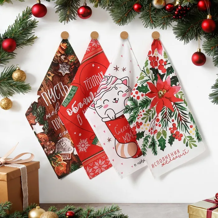 Набор новогодних кухонных полотенец Доляна «Новогоднее настроение» 35х60см-4 штуки, 100% хлопок