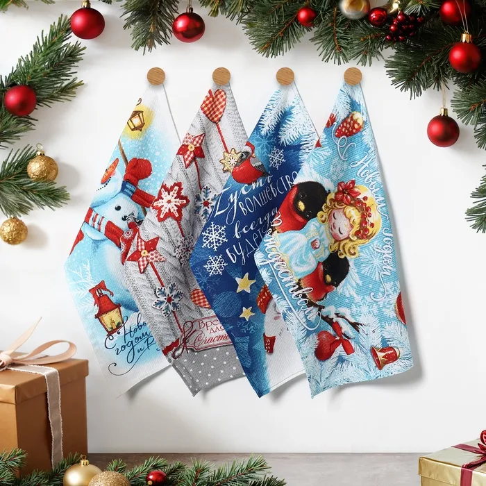Набор новогодних кухонных полотенец «Доляна» С Новым счастьем 35х60см-4 штуки, 100% хлопок