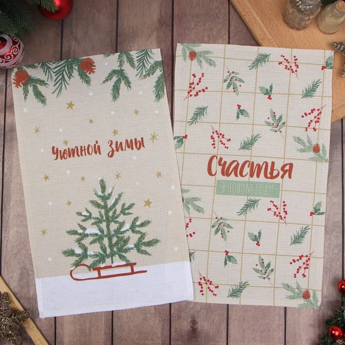 Набор новогодних полотенец Доляна "Зимние праздники" 28х46 см - 2 штуки, 100% хлопок, вафля 160 г/м2