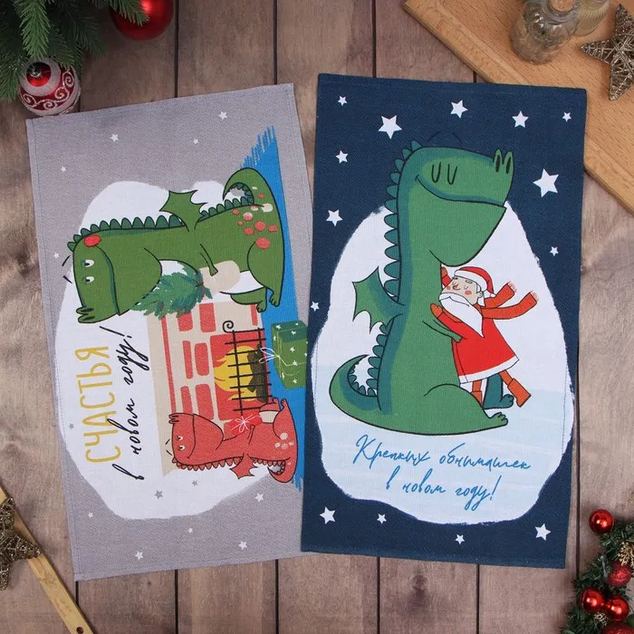 Набор новогодних полотенец Доляна "Крепких объятий" 28х46 см - 2 штуки, 100% хлопок, рогожка 164 г/м2