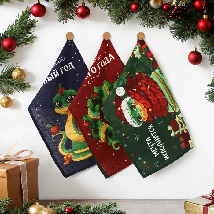 Набор полотенец Доляна "Встречайте новый год" 28х46 см - 3 шт, 100% хл, рогожка 164 г/м2