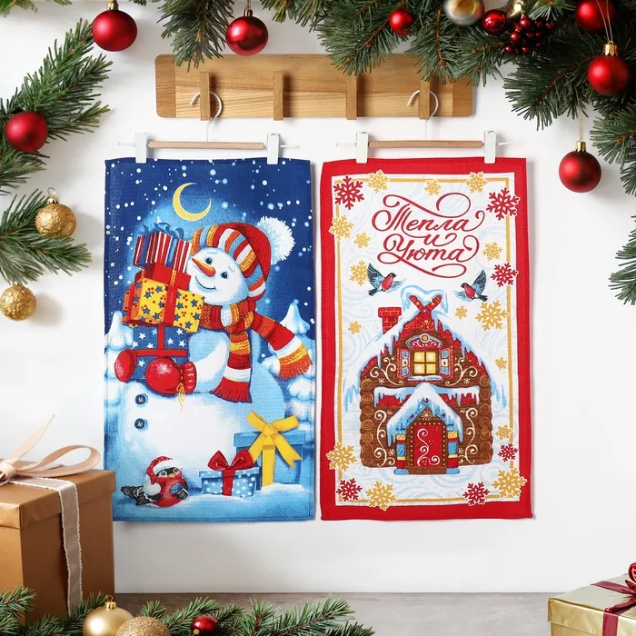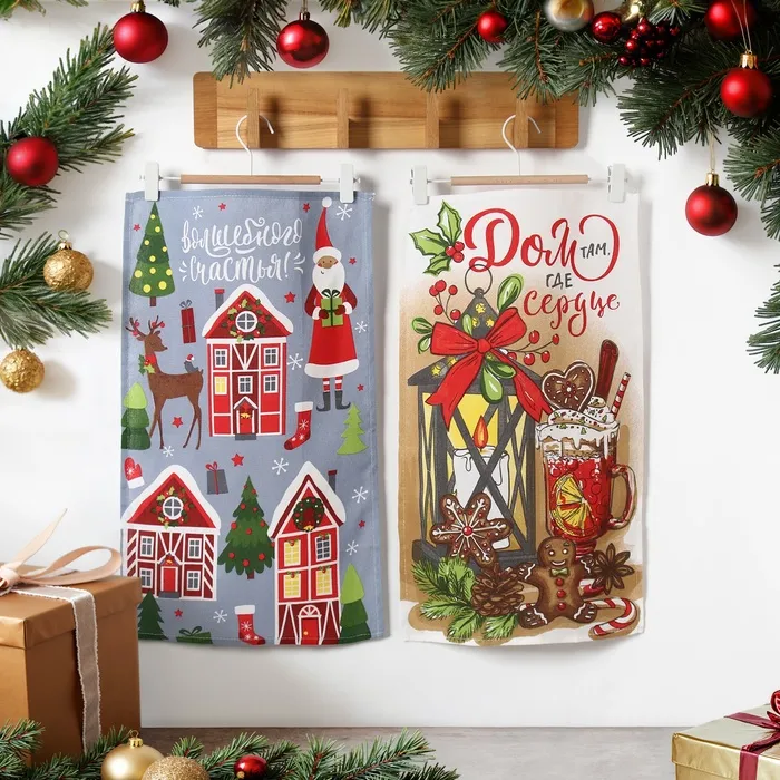 Набор новогодних кухонных полотенец Доляна «Пряничный домик» 35х60см-2 штуки, 100% хлопок