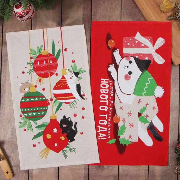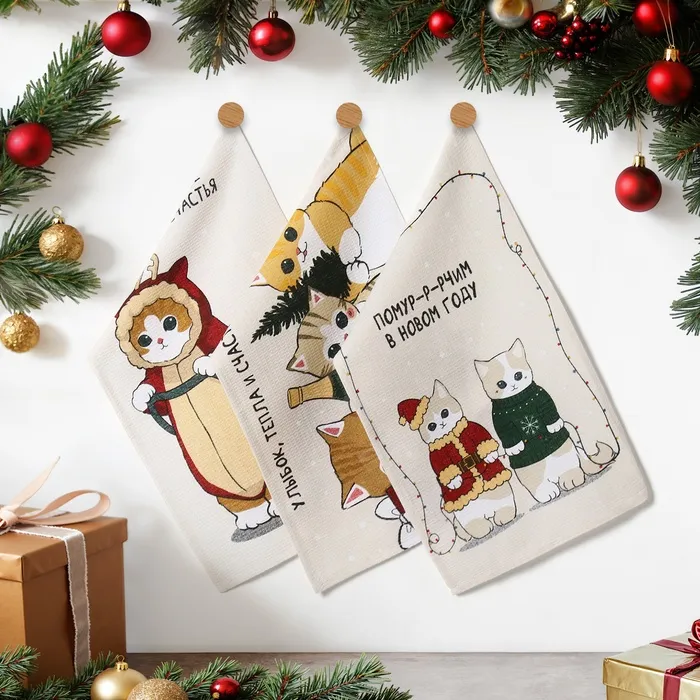Набор новогодних полотенец Доляна "Помурчим в новом году" 28х46 см - 3штуки, 100% хлопок, вафля 160 г/м2