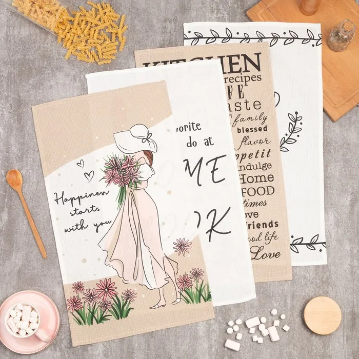 Набор кухонных полотенец Доляна Happiness, 35х60 см -4 шт, 100% хлопок, вафля 160 г/м2