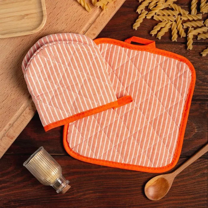 Кухонный набор Доляна «Полосы», прихватка 20х20 см, варежка 12х15 см, персик, 50% п/э, 50% хлопок