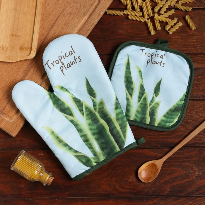Кухонный набор 2 предмета Доляна "Tropical" цвет голубой: прихватка 17х17 см, варежка 25х16 см, 100% п/э