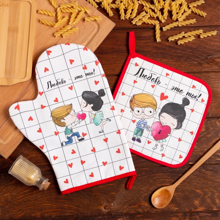 Набор Кухонный «Любовь - это ты», варежка-прихватка 20х28см, прихватка 19х19см, 100% хлопок