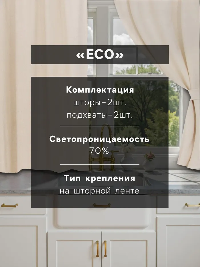 Шторы для кухни Этель ECO, цвет молочный, 130 +/-6×180 см - 2 шт., подхваты - 2 шт., 70% хлопок, 30% лён