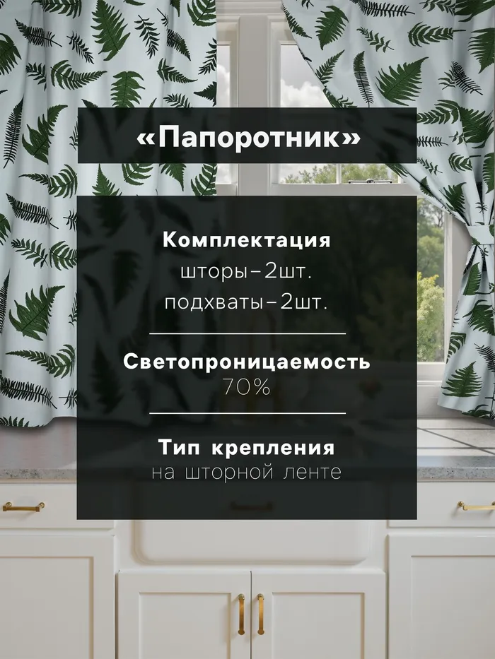 Комплект штор для кухни с подхватами Этель «Папоротник», 150×180 см - 2 шт., репс 220 г/м², 100% хл