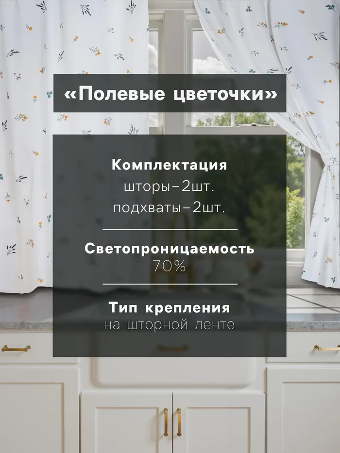 Комплект штор для кухни с подхватами Этель «Полевые цветочки», 150×180 см - 2 шт., рогожка 176 г/м²