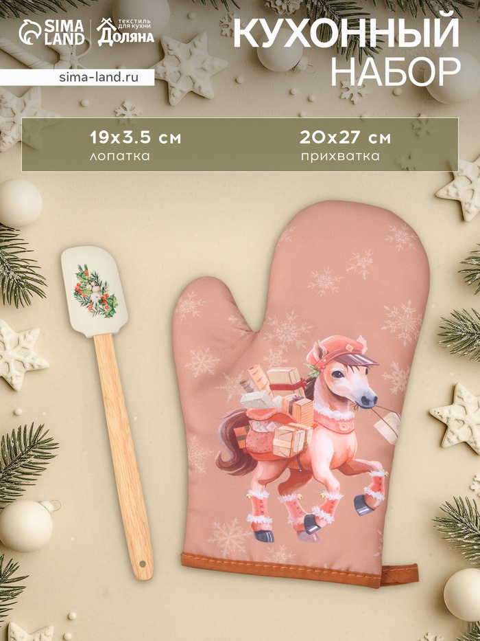 Набор подарочный новогодний «Почтовая лошадка» варежка-прихватка, лопатка силикон