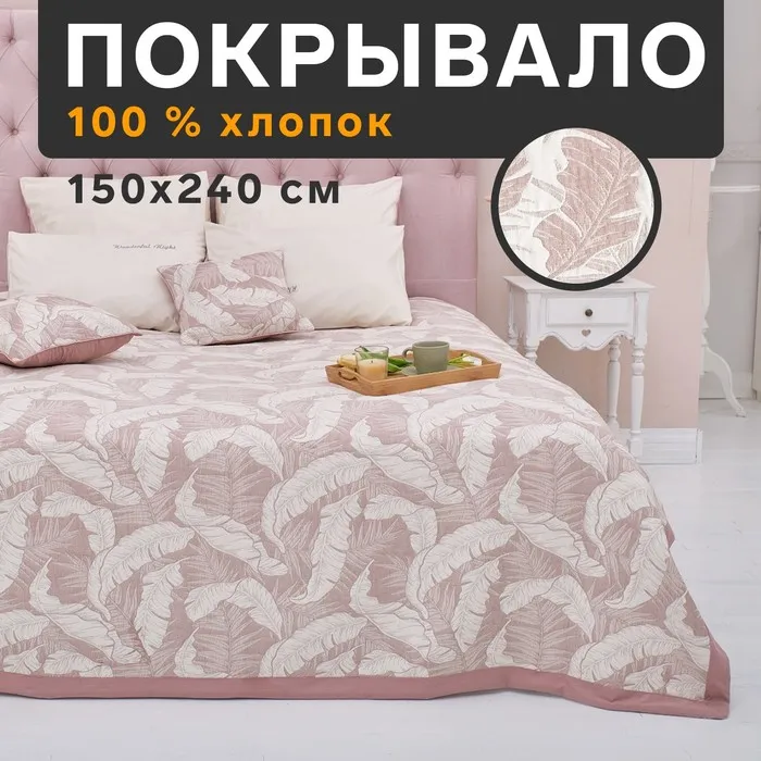 Покрывало хлопковое Этель «Перья» 150х240±5 см, цвет бежевый, 100%хлопок, 300гр/м2
