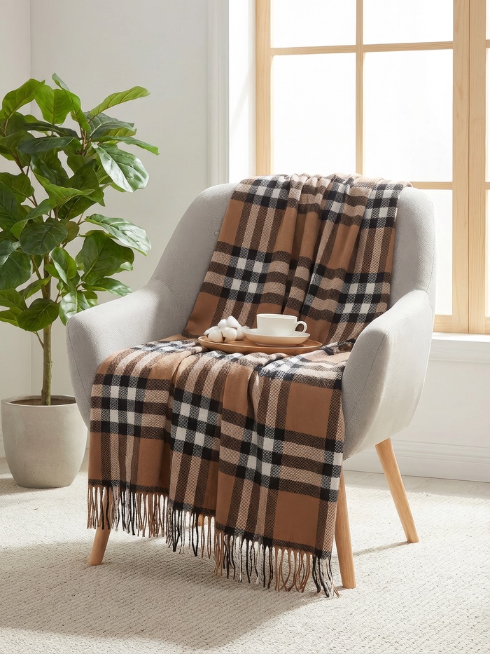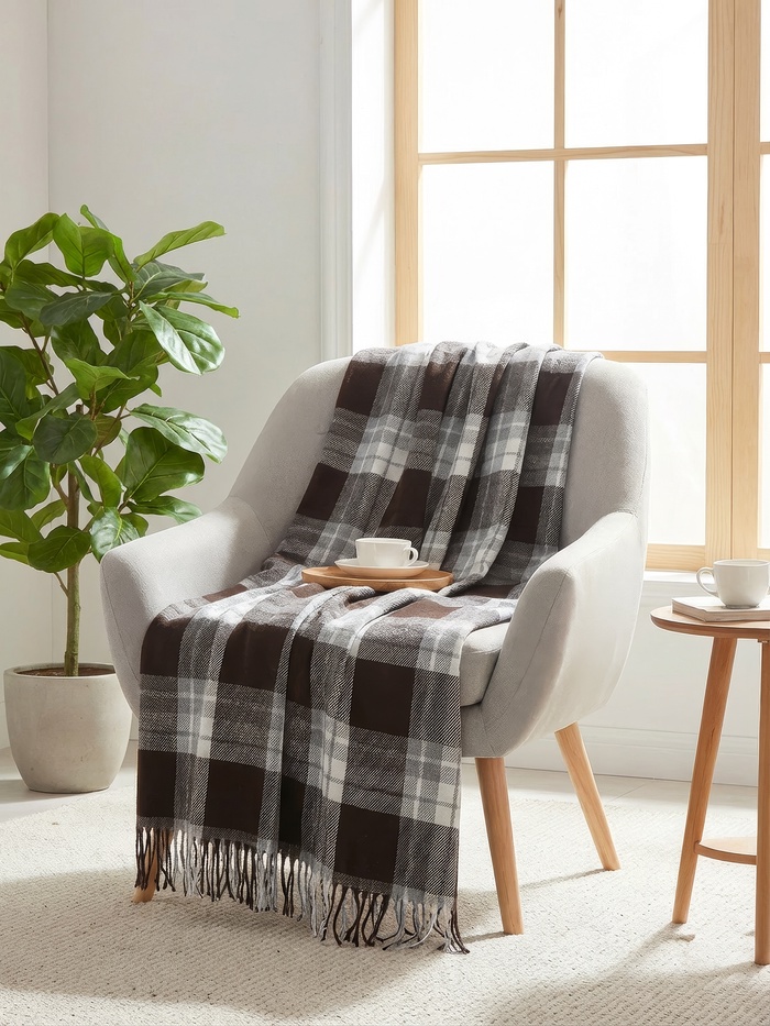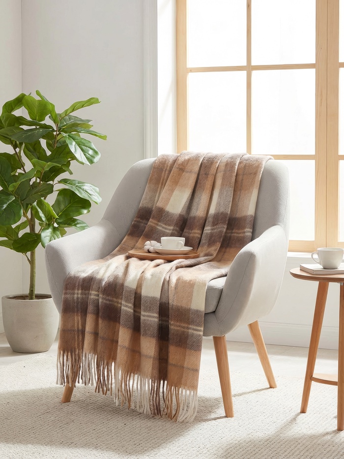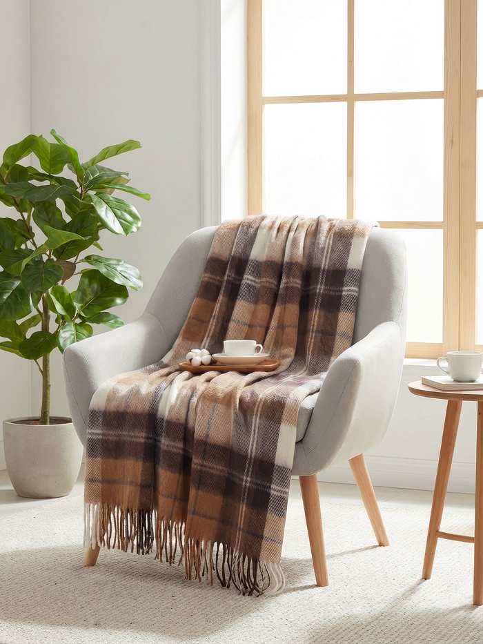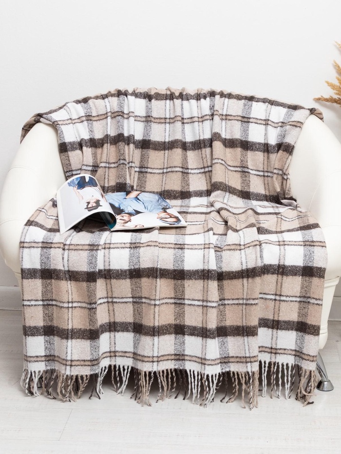 Плед с бахромой Vladi Palermo, 140×200 см, белый, коричневый, шерсть 20%, пан 40%
