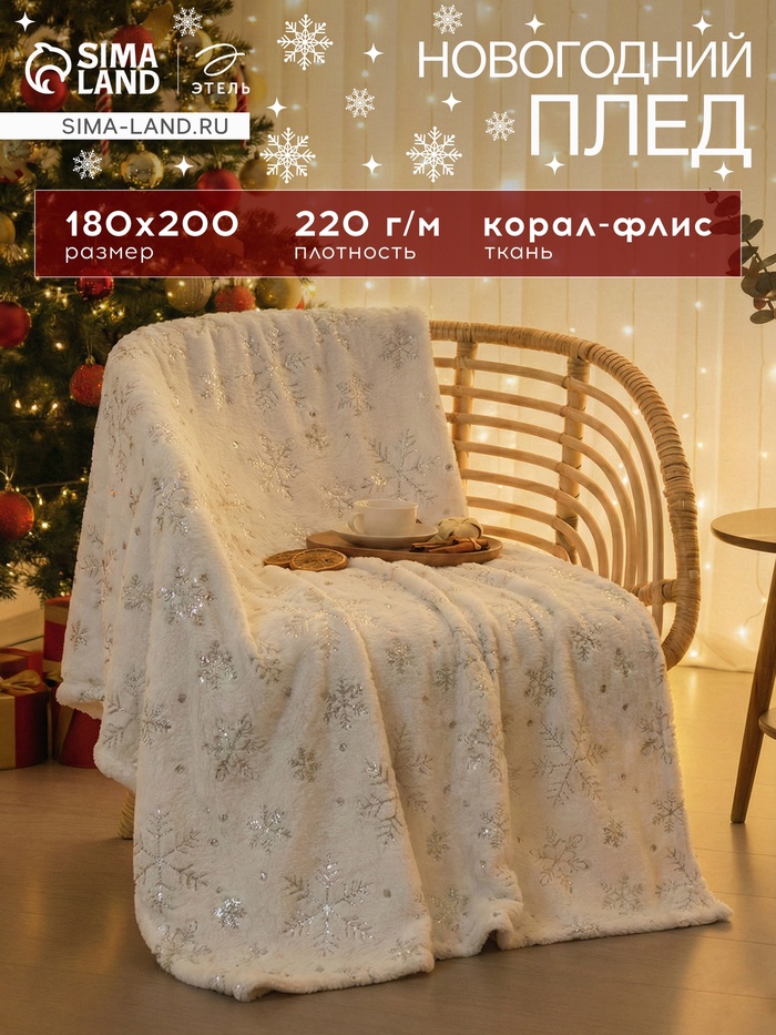 Плед «Этель» «Серебряные снежинки» 180×200 см,100% п/э, корал-флис 220 г/м²