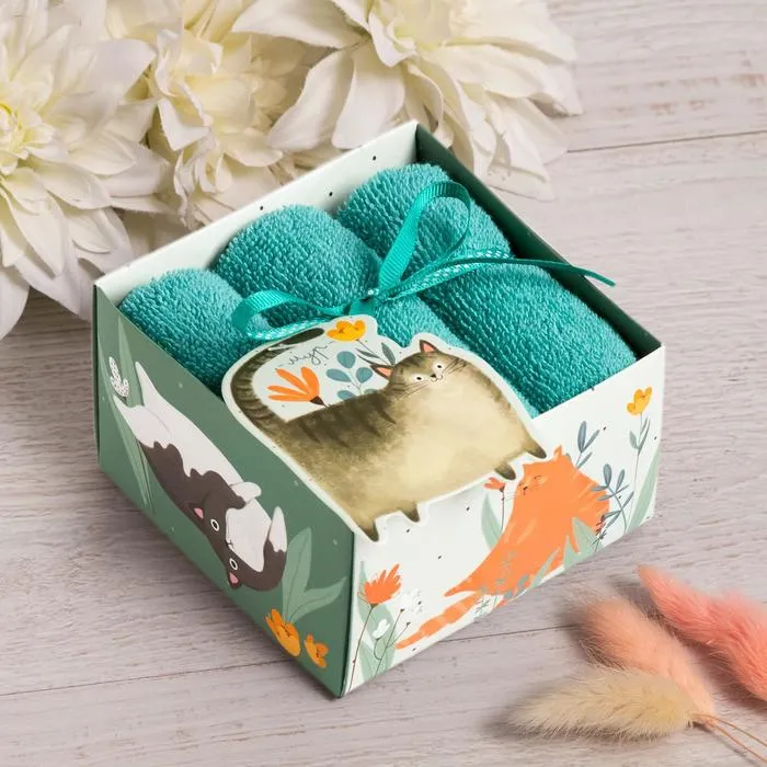 Набор махровых полотенец "Котики" 30х30 см - 3 шт, хлопок 340гр/м2