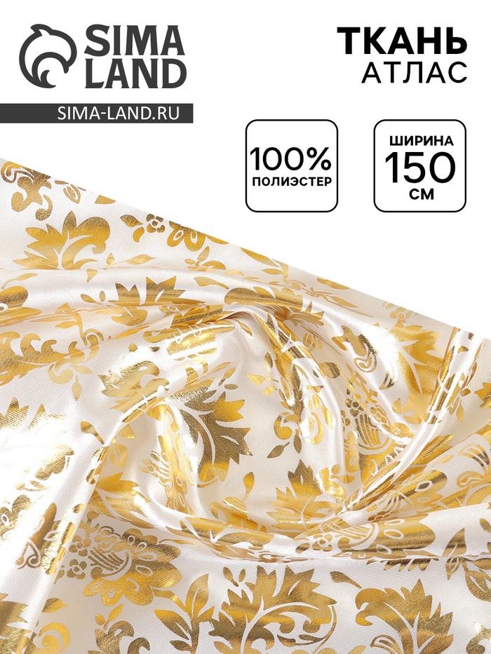 Ткань атлас для рукоделия и шитья, ширина 150 см, золотой узор на белом
