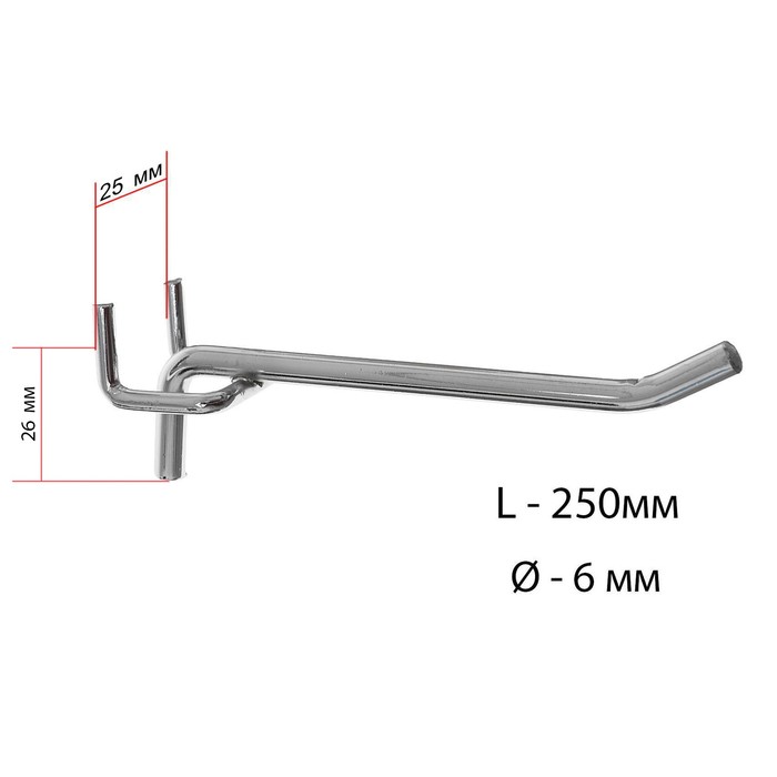 Крючок одинарный для металлической перфорированной панели, d=6 мм, L=25 см, шаг 25 мм, цвет хром (фасовка 10 шт.)