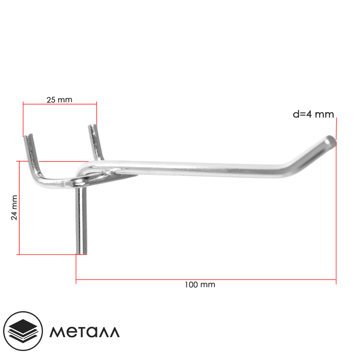 Крючок одинарный для металлической перфорированной панели, d=4 мм, L=10 см, шаг 25 мм