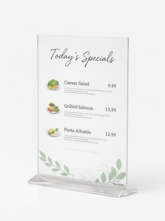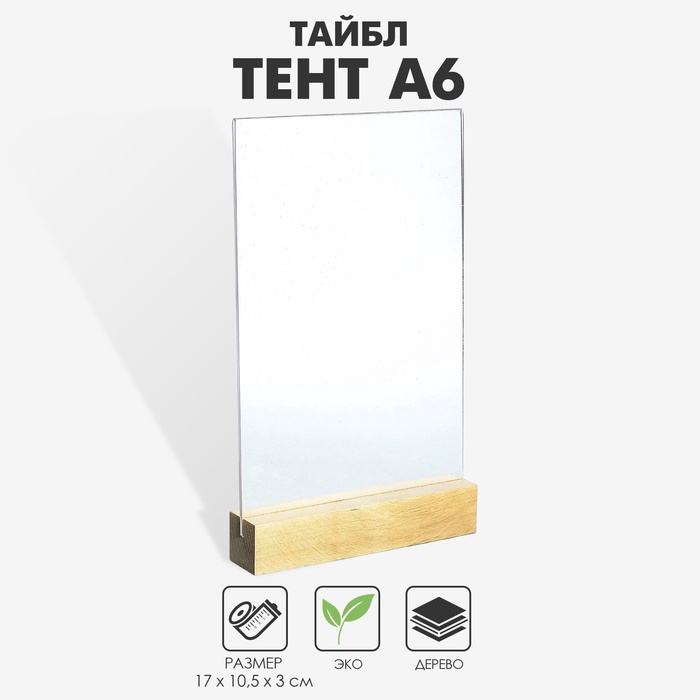 Тейбл тент А6, 17×10.5×3 см, оргстекло 2 мм, на деревянной подставке