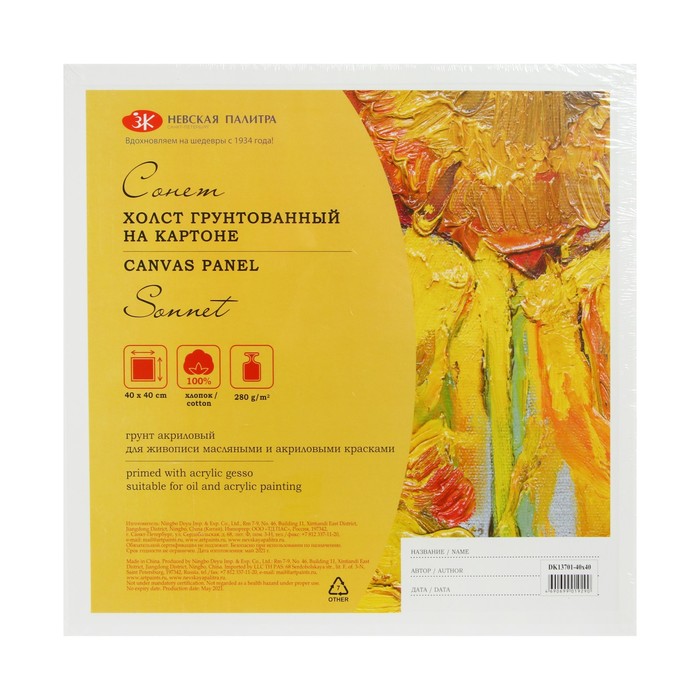 Холст на картоне 40 х 40 см, хлопок 100%, толщина 3 мм, акриловый грунт, мелкозернистый, ЗХК "Сонет"