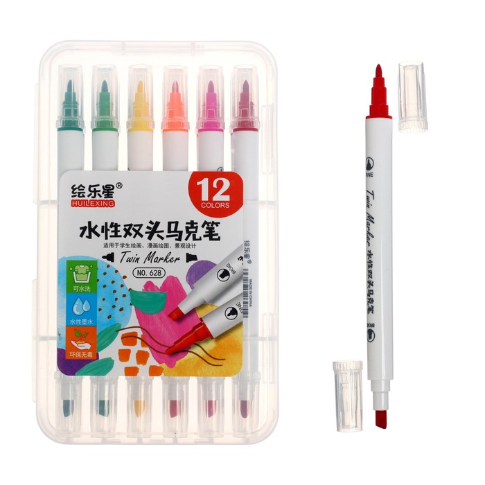 Набор маркеров 12 цветов, двусторонние, пулевидный и скошенный наконечники