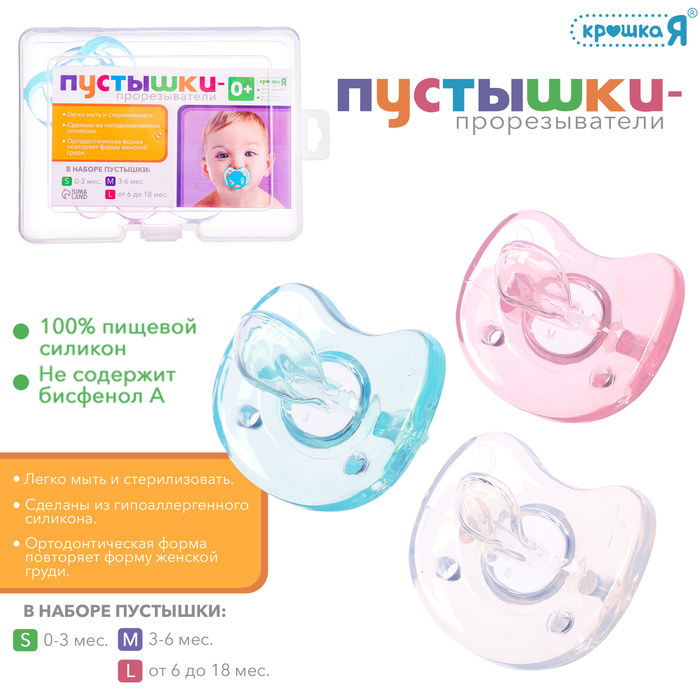 Прорезыватели для зубов, пищевой силикон, в контейнере, набор 3 пустышки