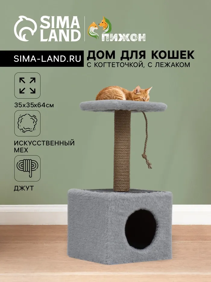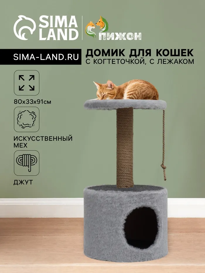 Домик для животных, с когтеточкой и полкой, джут, 32 х 32 х 64 см, серый