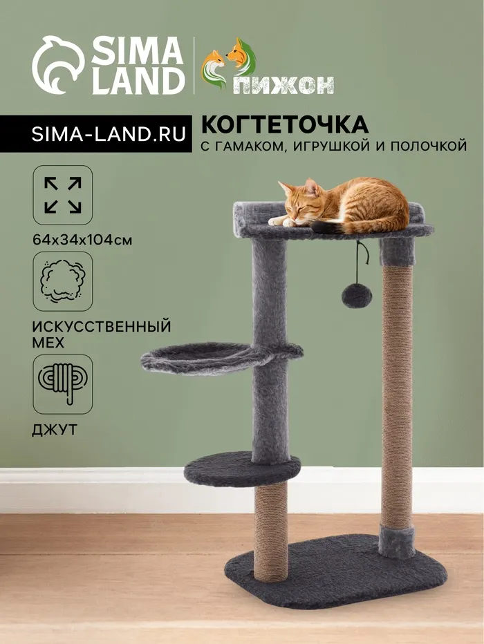 Когтеточка "Пижон" с гамаком, игрушкой и полочкой, 64 х 34 х 104 см, (мех, джут) серая